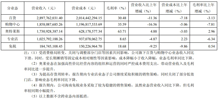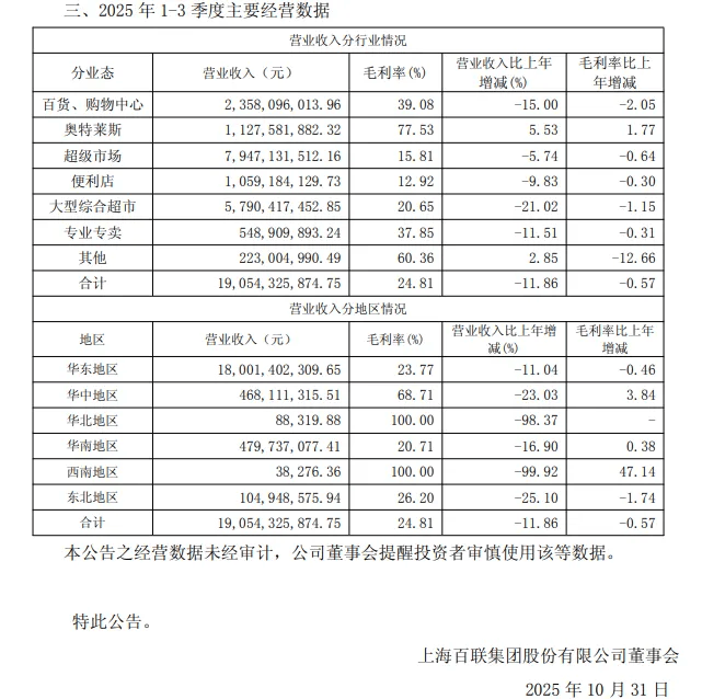 近日,百联股份发布2025年1-3季度经营数据公告显示,今年前三季度,百货、购物中心业态总收入23.58亿元,同比减少15%;毛利率39.08%,同比减少2.05的百分点。但奥特莱斯业态11.28亿元,同比增长5.53%;毛利率77.53%,同比增加1.77个百分点。超市、便利店、专卖店等营收均出现不同程度下降。